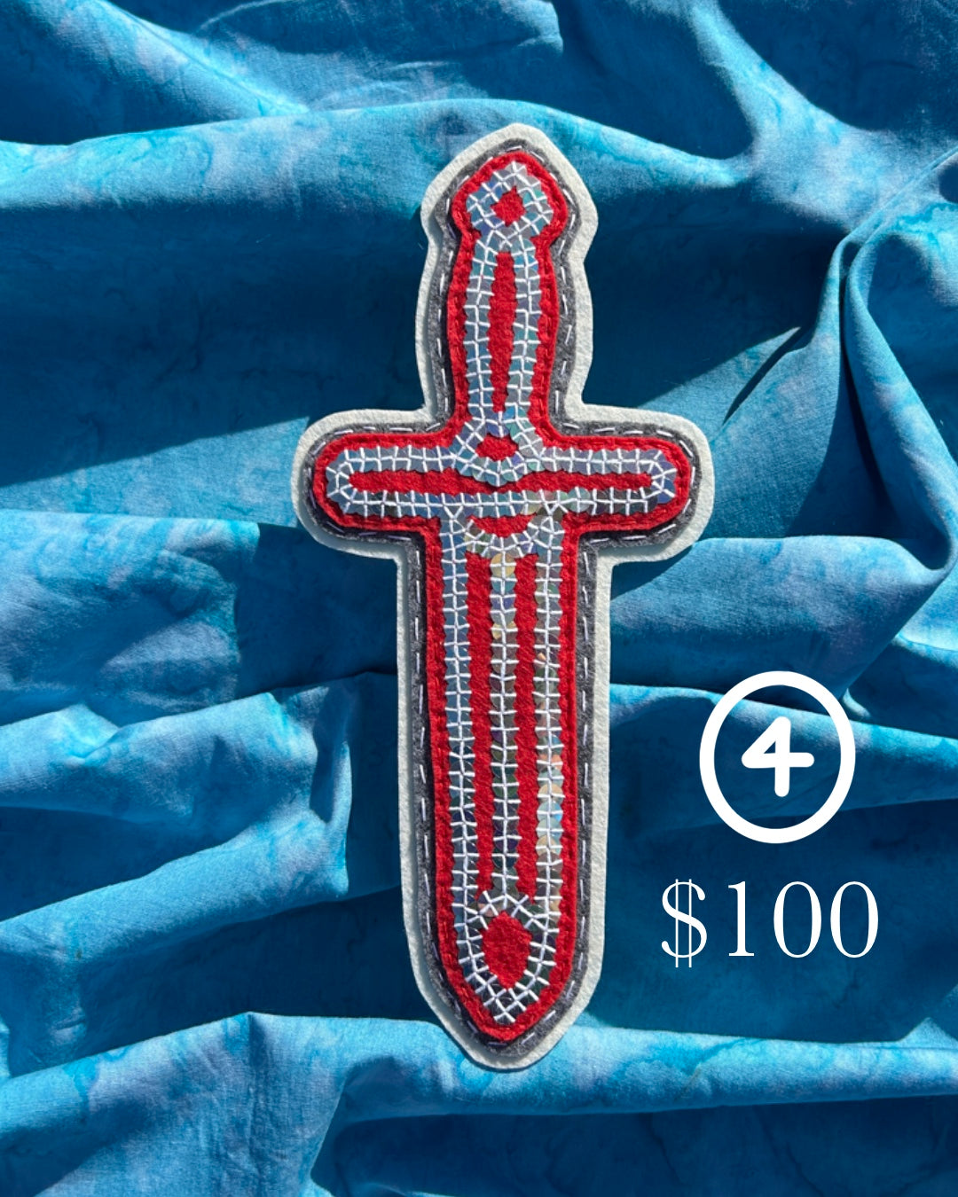 That being said, there are 9 different sword patches. They range in color, size and price ($30-125). I will list the height (and price) of each sword at the end of this description, but the prices can also be found in the listing photos and in the drop down menu when choosing which sword patch to add to your cart. The prices directly correspond to how long each piece took me and the intricateness of each piece, if you were curious to my system.